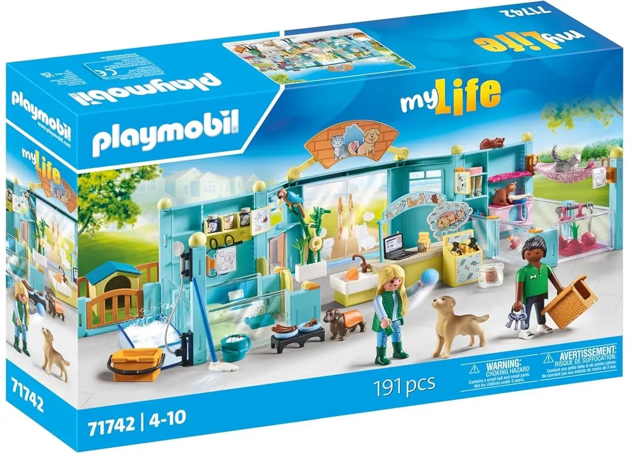 At the PLAYMOBIL Animal Hotel, every furry and feathered guest gets five-star care! With dedicated areas for dogs, cats, and even a playful parrot, there's space for everyone to feel at home. Dogs enjoy cozy kennels and a wash station with a working hand shower, while cats lounge in hammocks or chase toys. Personalize feeding boards with included name tags and decorate the hotel your way!