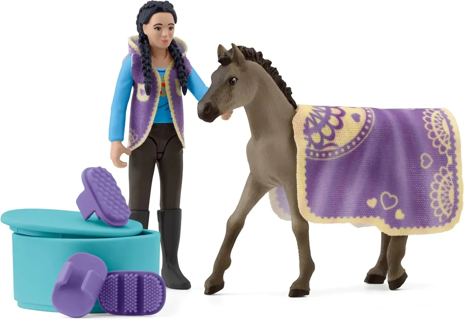 Set includes: 1x Kim figure, 1x Criollo Definitivo foal, 1x horse blanket, 1x vest, 1x crate, 1x finger sponge, 1x finger brush, 1x finger curry comb