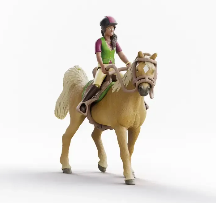 Set includes: 1x Sarah figure, 1x Mystery horse, 1x helmet, 1x bridle with reins, 1x saddle, 1x bracelet 1x saddle