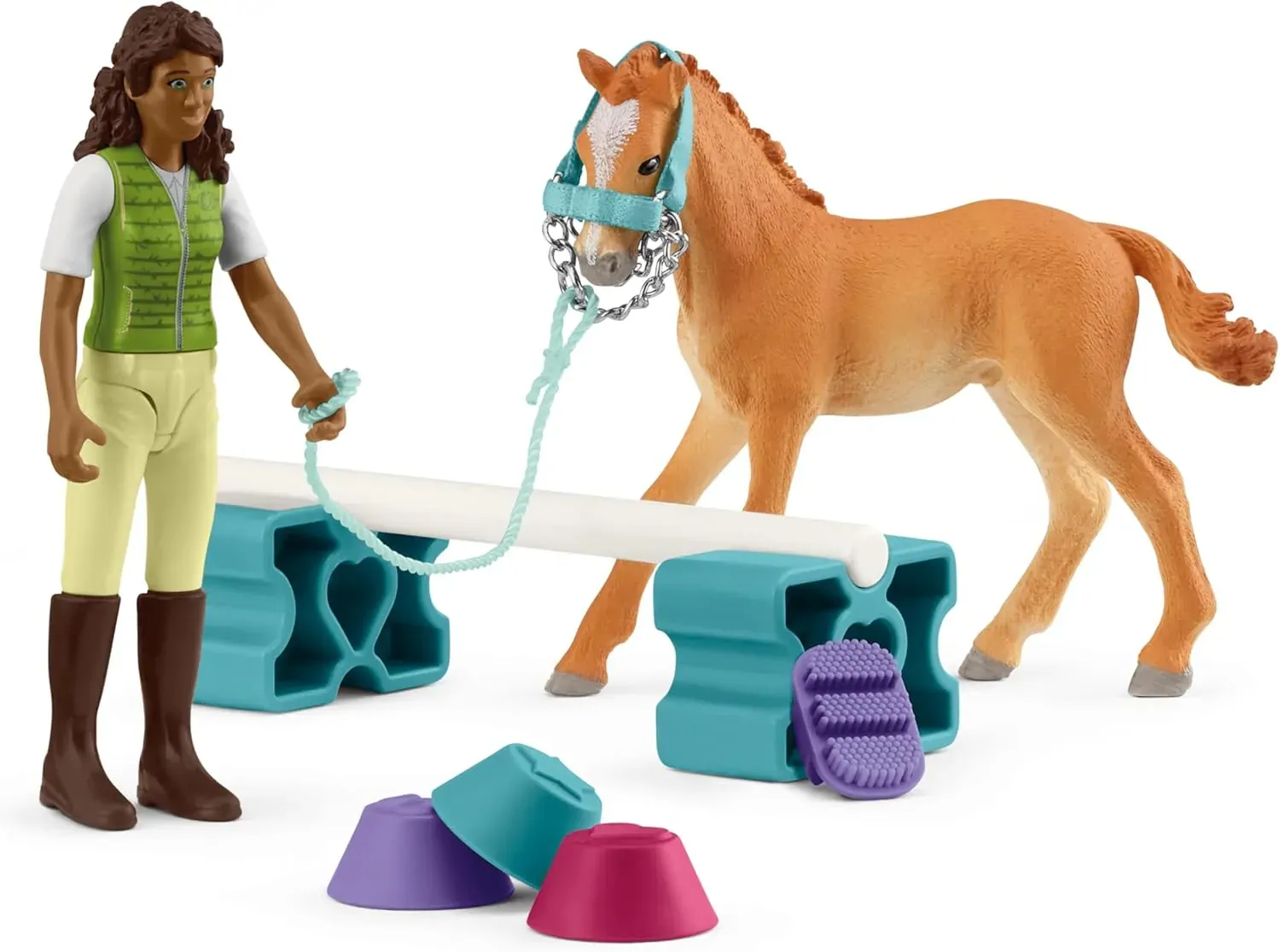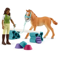 Set includes: 1x figure Sarah, 1x Tennesse Walker foal, 1x cavaletti heart, 1x steep vault pole, 1x stable halter, 3x marker, 1x finger grooming brush