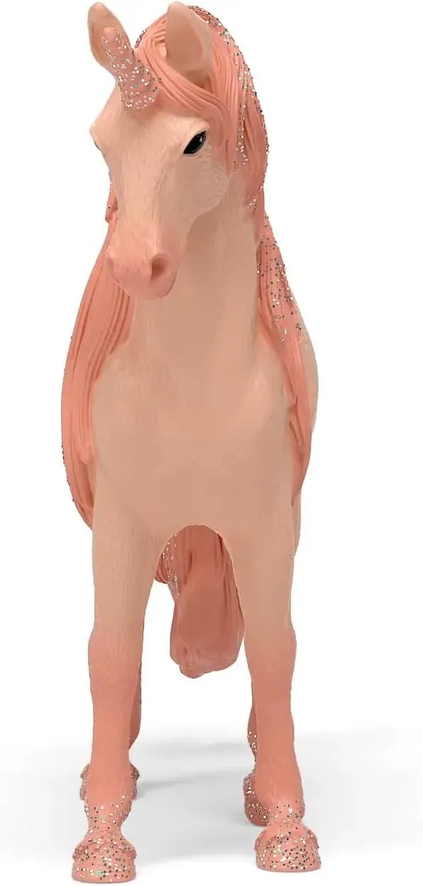 The unicorn mare Peach is simply adorable with its delicate peach-coloured coat. The hooves sparkle in the sun and the mare has a sparkling horn on its forehead. The dense mane and tail also shine with all the glitter in it. She has a beautiful tattoo on her side. Lovely!